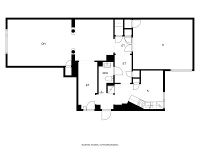 Lounge-tilassa tilaa ruokapöydälle tai sohvakalustolle- keittiöön sopii pieni ruokapöytä.