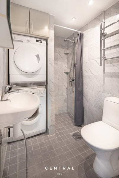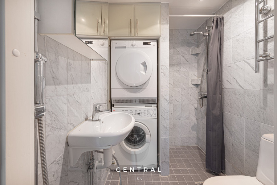 Kylpyhuoneen varustetasoWC-istuin, suihku, pesukone, kuivausrumpu, pesukoneliitäntä, peilikaappi, pesuallas ja bidee-suihku
