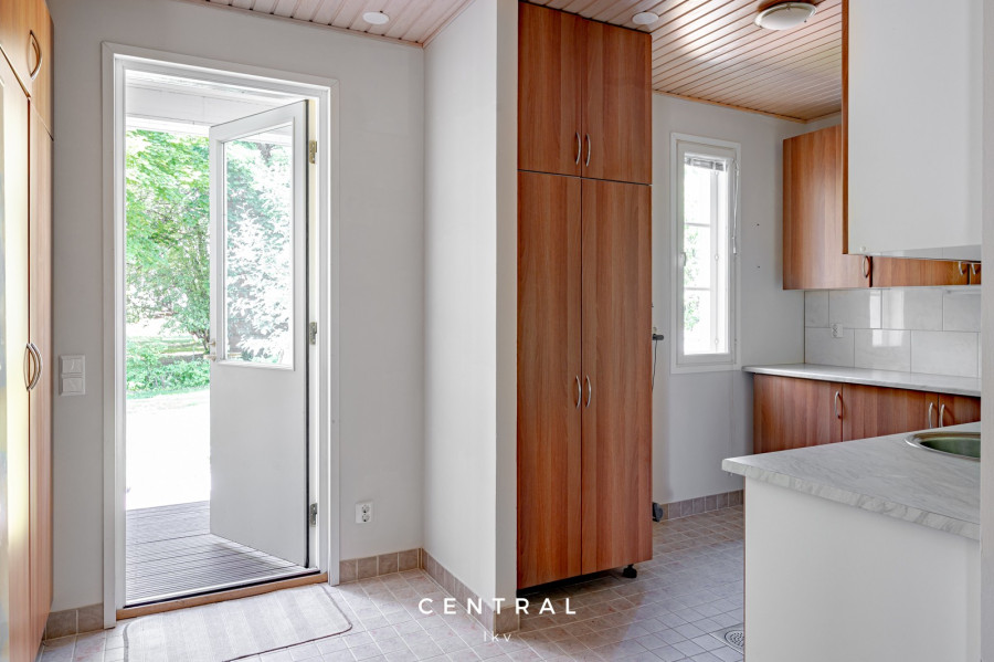 | Kodinhoitohuoneen kuvaus | Tilava kodinhoitohuone, jossa runsaasti lasku- ja kaappitilaa, sekä kulku suoraan pihalle. |