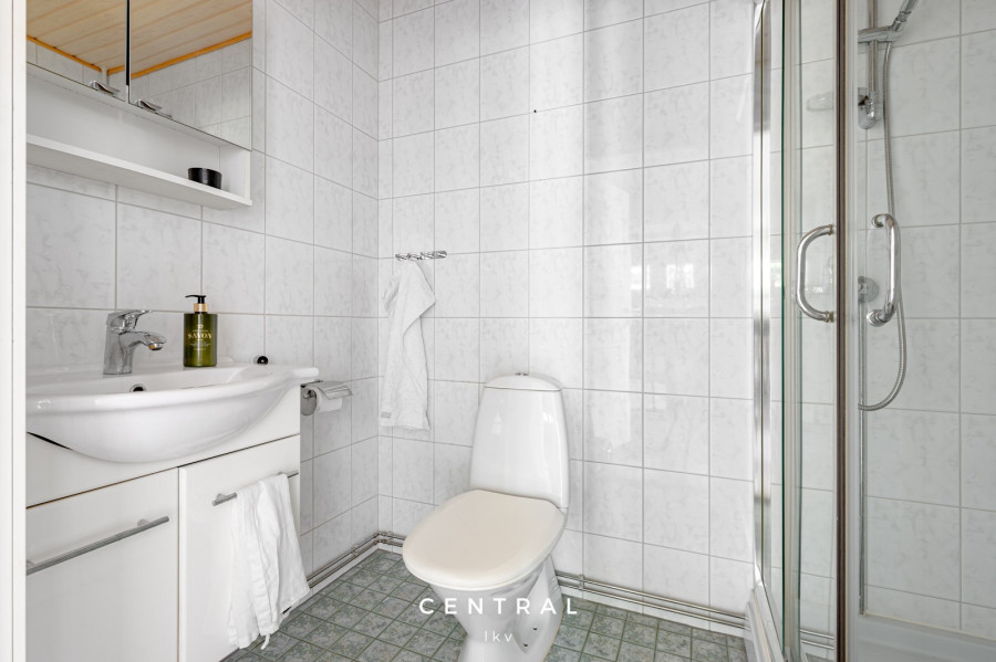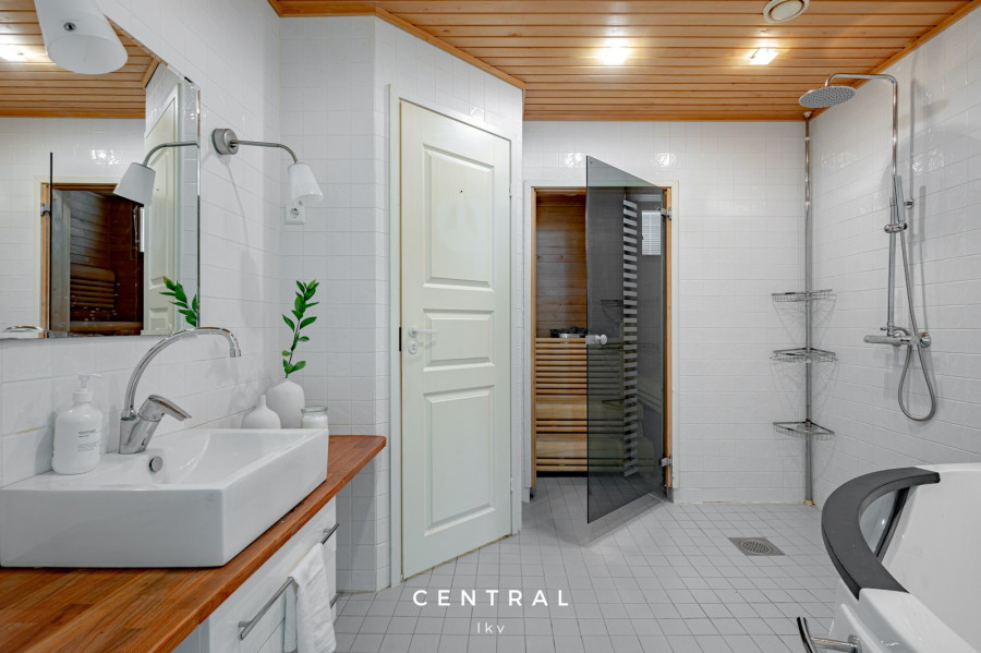 | Kylpyhuoneen kuvaus | 3 kylpyhuonetta, joista kaksi yläkerrassa ja kolmas saunan yhteydessä alakerrassa. Yläkerran kylpyhuoneissa suihkut ja alakerran kylpyhuoneessa poreamme ja suihku. Kaikkien kylpyhuoneiden yhteydessä wc. Sisääntulon yhteydessä yksi erillinen wc. |