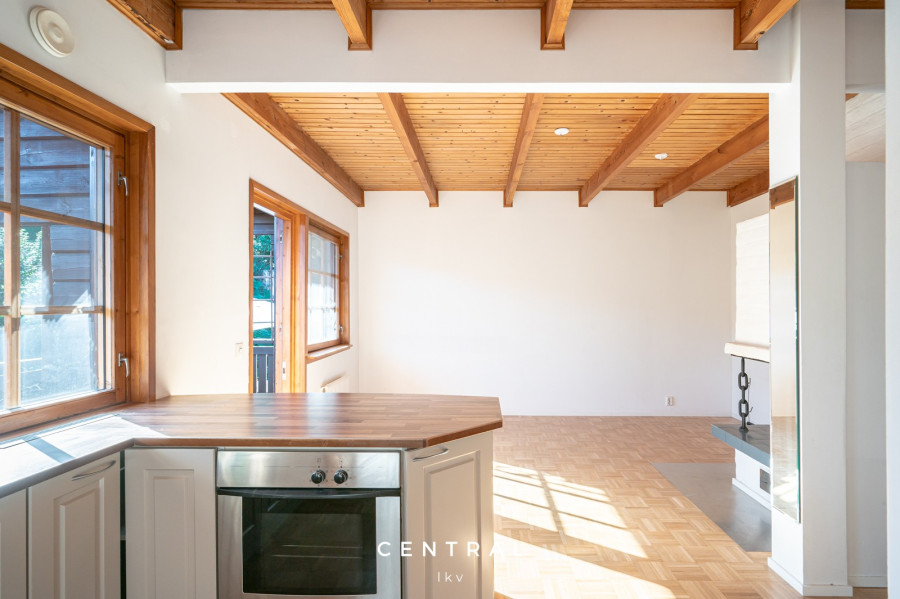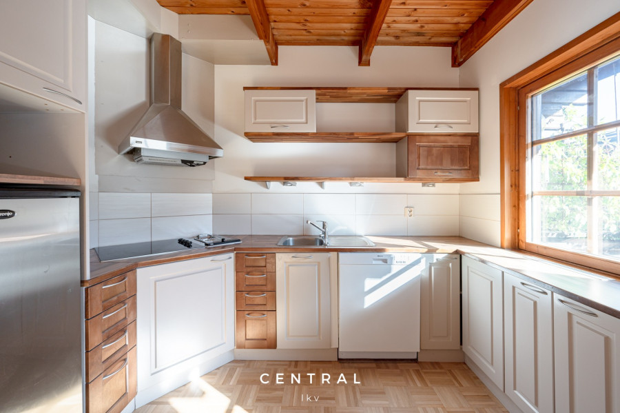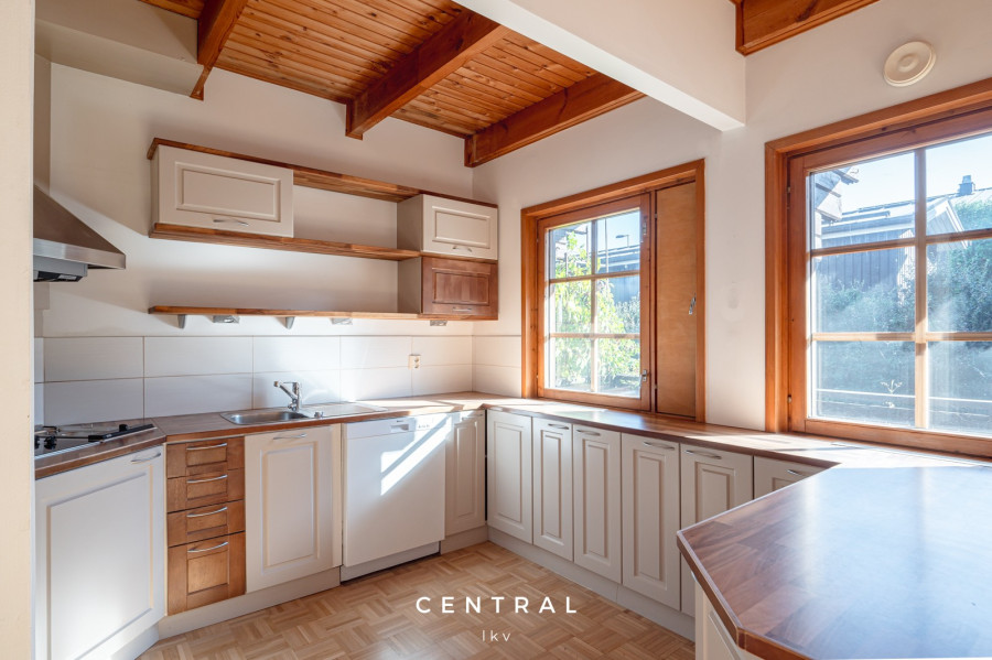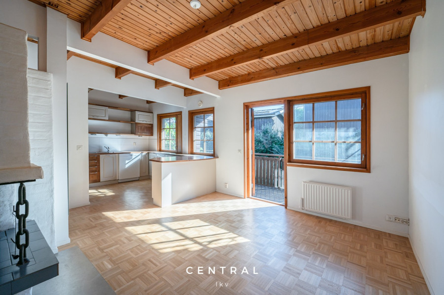 | Keittiön kuvaus | Saareke erottaa keittiön olohuoneesta, jossa takka. |