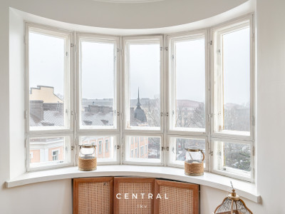 Elegant hörnbostad, med fönster mot fyra väderstreck och vackra öppna park- och stadsvyer. Separat rymligt och trivsamt kök - det finns planer för fransk balkong i samband med köket. I samband med rörsaneringen år 2022, förnyades bostadens två badrum och två toaletter. Det ena badrummet har badkar, det andra dusch. Separat hemvårdsrum.